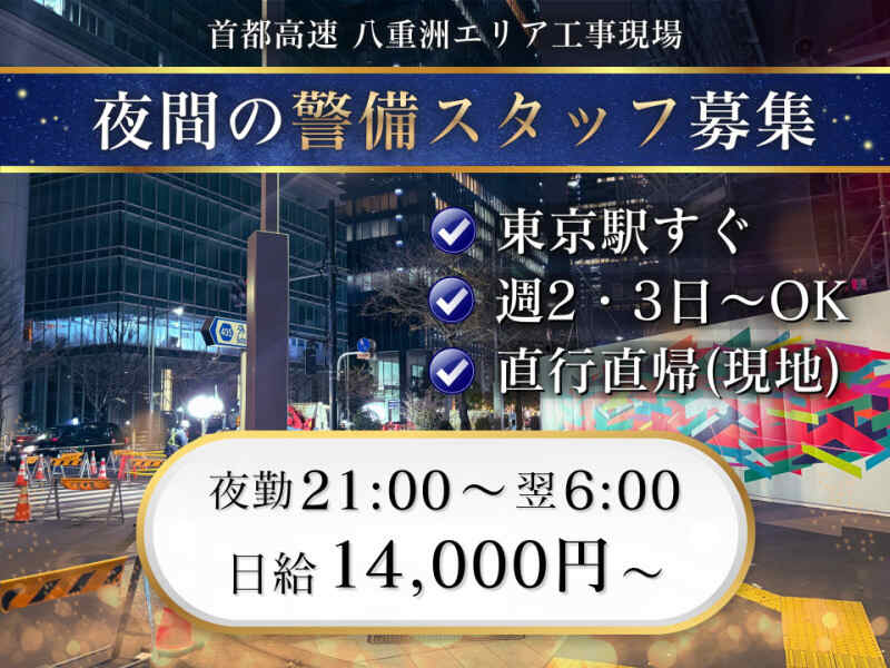 東京駅徒歩1分の駅チカ現場で、夜勤なら日給14,000円、資格者は18,500円としっかり稼げる警備のお仕事です。現場事務所で朝礼後そのまま現場へ向かうため直行直帰OK。履歴書不要で応募できます◎