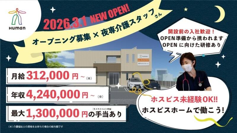【川崎市多摩区】2026年3月OPEN!ホスピスホームの夜勤専従/1勤務3万円以上/初任者研修以上/ホスピス未経験者も大歓迎/夜間も看護師が常駐しているので安心/車通勤OK