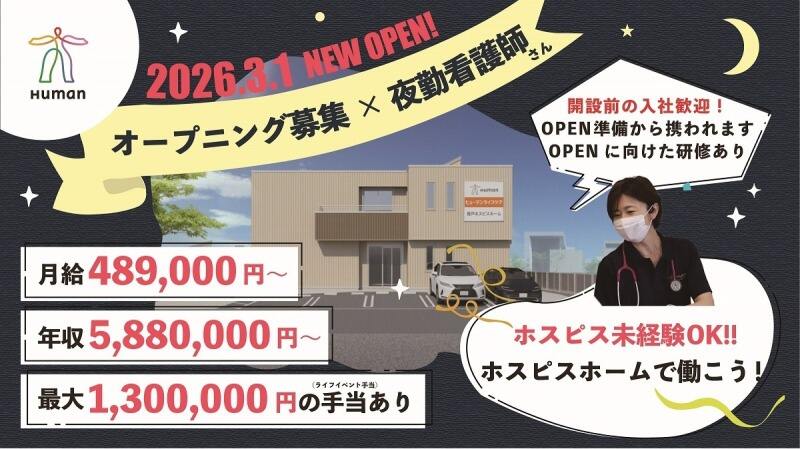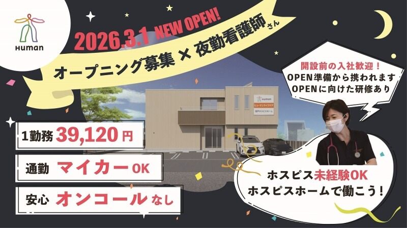 【川崎市多摩区】2026年3月OPEN!ホスピス未経験OK/1勤務39,280円/夜勤看護師2名体制/オンコール無し/車通勤OK