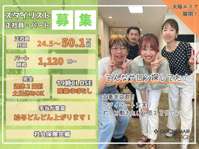 \喜連瓜破駅前サロン/大阪8店舗展開の地域密着サロンで働きませんか?再来率80%の愛されサロン♪指名手当でどんどん給与UP!!アットホームな環境でママさんも働きやすい◎お気軽にご相談ください♪