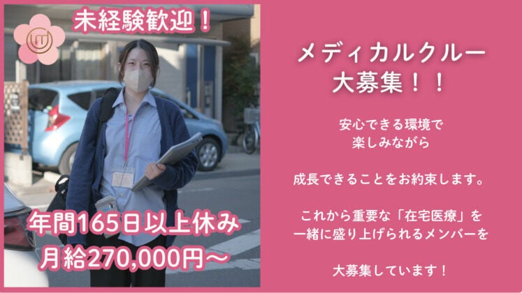 梅本ホームクリニックでの訪問診療業務。 患者様宅訪問や診療補助を行いながら、週休3日で安定した働き方を実現します。