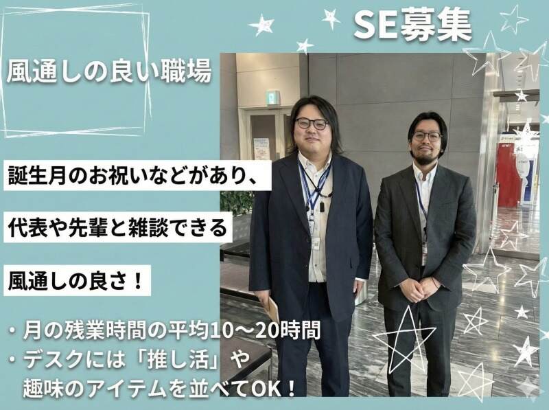 趣味も推し活も全力OK!デスクにお気に入りを並べて、自分らしくSEリスタート。誕生月には社長からケーキのプレゼントも!年間休日120日&残業少なめで、仲間と支え合いながら楽しく働ける職場です。